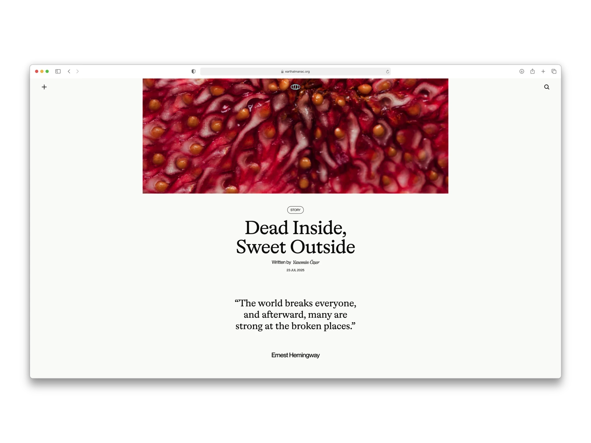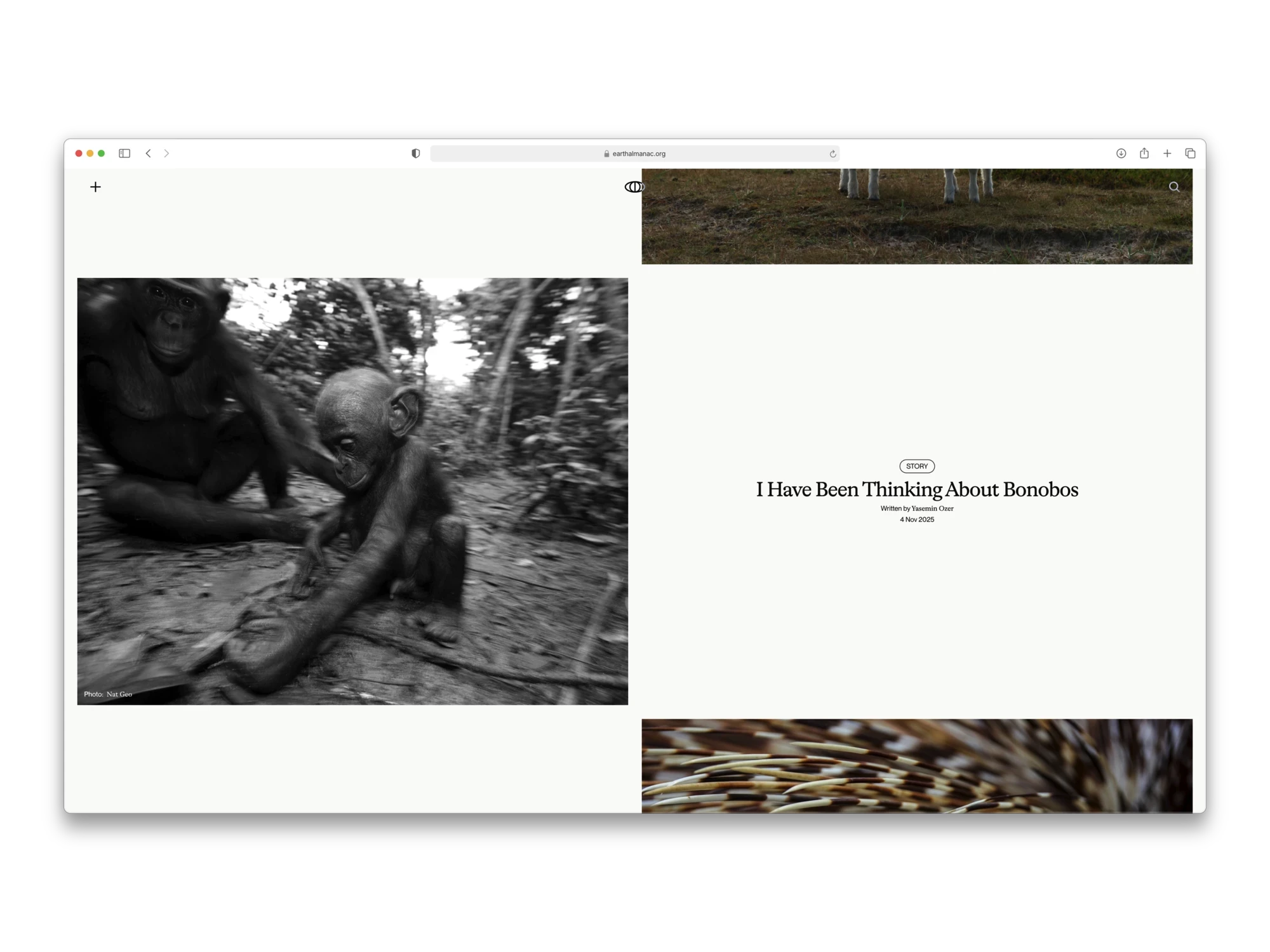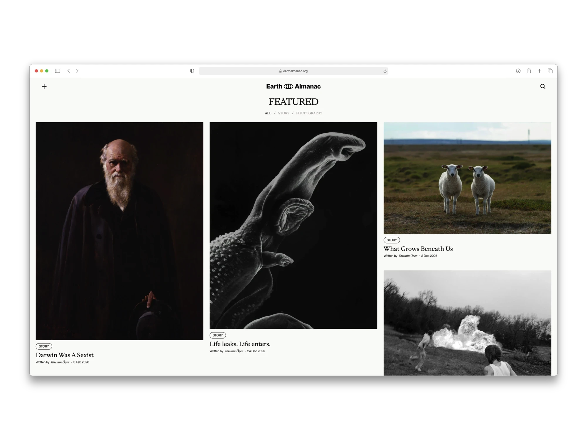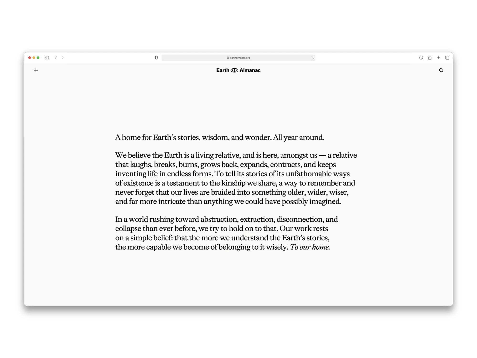 Earth Almanac is an ongoing collaborative project developed together with a collaborator with background in environmental studies, functioning as a blog that explores human–Earth relationships through long-form ecological writing. My role is to design and maintain the platform that frames this content: developing the visual identity, editorial system, and digital interface that shape how the writing is encountered and interpreted. The project focuses on translating complex ecological narratives into a calm, legible reading experience, using design to support reflection, continuity, and care rather than distraction.